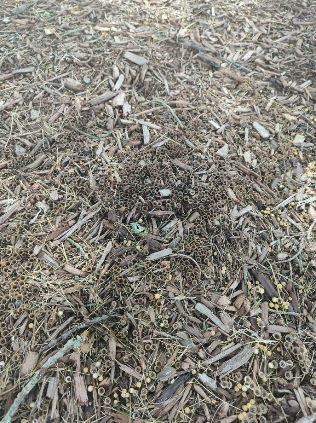 В куче мульчи внезапно проявился ковёр из крошечных трубочек. Будто кто-то устроил микро-панельные дома для насекомых. Паттерн появляется из хаоса и сразу гипнотизирует. Сделаешь шаг в сторону — и он снова прячется.