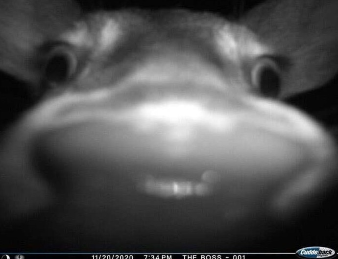 Ночное селфи от оленя, который слишком буквально понял фразу «подойдите к камере». Нос — как луна в перигее, глаза — как две звезды. Техподдержка трайла просит впредь держать дистанцию.