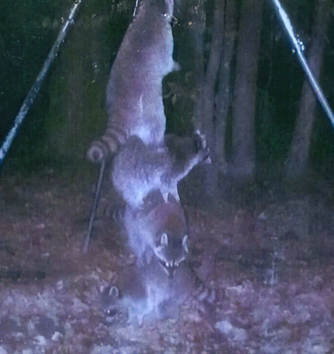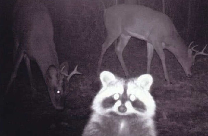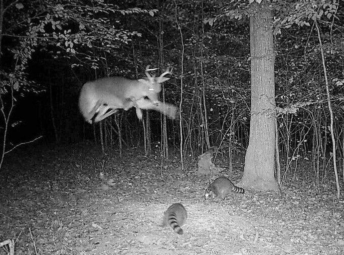 Пока еноты заняты ужином, над ними пролетает олень, практикующий ночной паркур. Поза — как у супергероя на взлёте. Никто даже не отвлёкся: у каждого свои приоритеты.
