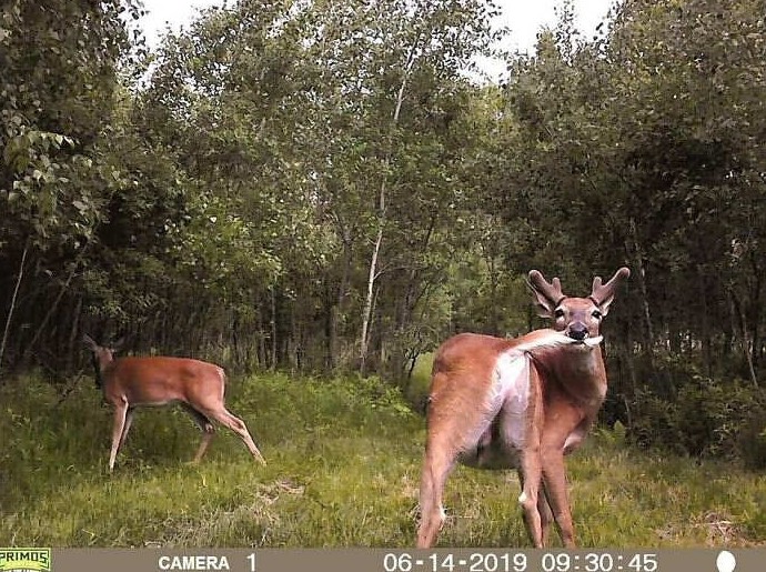 Олень задрал нос и ловит все ароматы леса, а компания на заднем плане продолжает бранч. У каждого свои приоритеты: кто-то ест, кто-то нюхает. Камера же наслаждается натюрмортом из ушей и деревьев.