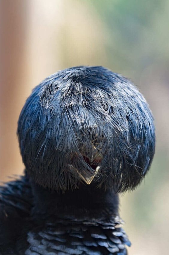 «На фотографии изображена амазонская зонтичная птица (Cephalopterus ornatus). Я сфотографировал её в лесу в Пантанале, Бразилия. Она выглядела больной и не могла летать, поэтому я обратился к ветеринару в соседнем городе: они приехали и забрали её на лечение — очень надеюсь, что всё прошло хорошо. В полёте или во время кормления хохолок из перьев на голове, который в опущенном состоянии полностью закрывает лицо, откидывается назад, образуя подобие остроконечного хохолка. Но когда он вытягивает его вперёд, невозможно не смеяться: выглядит это просто смешно!»