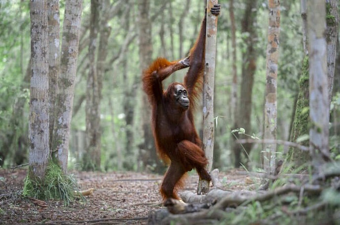 «Эта фотография была сделана в национальном парке Танджунг-Путинг на юге Борнео и изображает Сандру, старейшего из известных орангутанов этого региона. Сандра, прожившая в неволе, прошла реабилитацию и затем успешно вернулась в дикую природу. Известная своим оригинальным и уникальным характером, она сразу же почувствовала себя комфортно в нашем присутствии и вскоре действительно «нашла свою нишу».»
