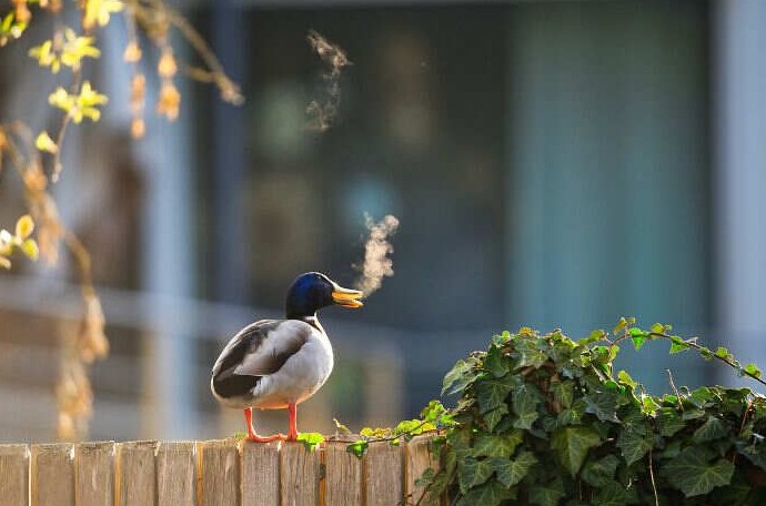 «Этой весной мне поручили сфотографировать дикую природу города неподалёку от моего в Баварии. Проведя несколько ранних утр у пруда, я решил вернуться на то же место ещё раз. Утро было ужасно холодным, настолько холодным, что можно было видеть собственное дыхание. Когда первые лучи солнца начали пробиваться из-за забора, я заметил крякву, сидящую на заборе и крякающую в воздухе. Я быстро нажал на кнопку спуска затвора, надеясь запечатлеть пар, поднимающийся из её клюва. Эта сцена заставила меня улыбнуться: казалось, утка вышла на минутку… выкурить сигарету в холодном утреннем свете.»