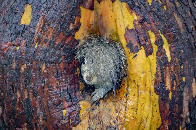 «Для своей фотографии «День плохих волос» я была в парке, когда увидела промелькнувшую серую тень. Присмотревшись, я поняла, что это серая белка-мать переносит своих детенышей в новое гнездо. В то утро трава была мокрой от росы, поэтому её хвост на бегу намок. Когда она забежала в новое гнездо, её хвост торчал наружу, а когда она повернулась, чтобы уйти, её голова на мгновение оказалась покрытой мокрым хвостом. Увидев это, я улыбнулась: это напомнило мне тот момент, когда только мыл голову, и вдруг раздаётся звонок в дверь! Мне также понравились текстура и цвет коры дерева, окружавшего её, которые идеально соответствовали её «плохим волосам».»