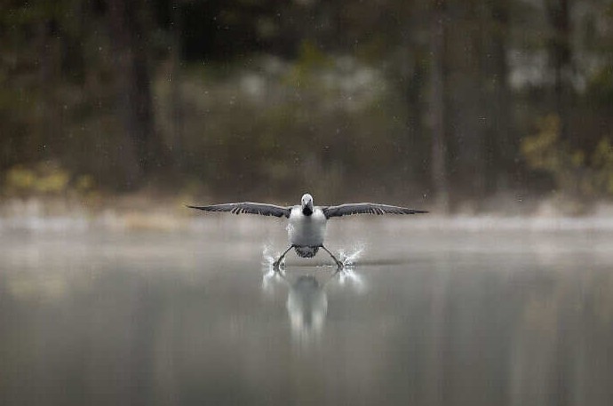 «Эта фотография – плод победы, одержанной благодаря терпению. Я фотографирую красношейных поганок (или красношейных гагар) уже несколько лет. Я лежу на краю пруда, спрятавшись под маскировочной сеткой, чтобы запечатлеть их весенние брачные ритуалы. Земля сырая и холодная. В то утро непривычный для этого времени года снегопад застал меня врасплох, и сделать снимок было практически невозможно. Лежа на замёрзшем берегу пруда, я подумал, что нет смысла здесь оставаться. Я чуть не ушёл. Однако я решил подождать ещё немного. Снегопад превратился в лёгкие, бесшумные хлопья, и над озером поднялся лёгкий туман. Ещё одна краснозобая гагара на озере побелела от снега. По её поведению я понял, что приближается её партнёр, и мне удалось сфокусировать на ней взгляд на фоне серого неба. Я на мгновение потерял её из виду, но снова нашёл прямо перед тем, как она приземлилась на воду. Краснозобая гагара не очень хорошо летает, и приземляется она обычно довольно неуклюже: балансирует, вытянув ноги назад, а затем соскальзывает на воду брюхом вниз. Я люблю говорить, что она использует озеро как посадочную полосу.»