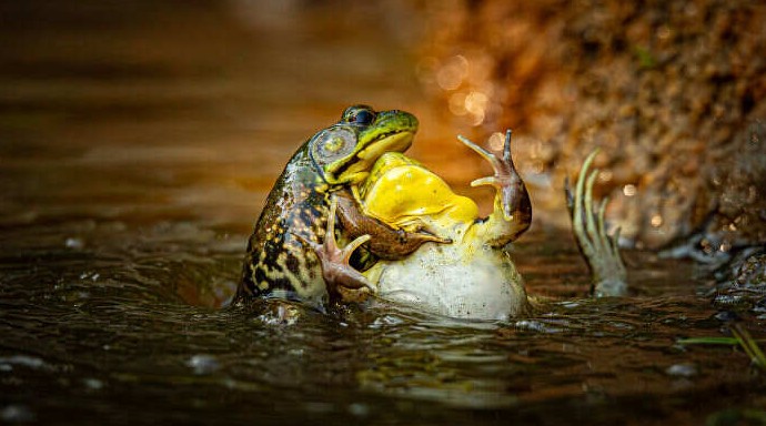 «Однажды утром я стоял с фотоаппаратом у пруда недалеко от дома. Я заметил двух дерущихся лягушек и сделал серию снимков. На снимке изображены два самца зелёных лягушек, вида, обитающего в штате Мэн. Обычно у них зелёно-коричневые спины с тёмными полосками на задних лапах и более светлый низ. У самцов часто жёлтое горло, а у самок белое. Их крик — гортанный звук, похожий на стук. В этой сцене два самца борются за территорию. Они могут даже вступить в физическое сражение, похожее на борьбу, чтобы защитить ценную территорию, привлекающую самок. Я сделал несколько фотографий, но эта особенно меня рассмешила: похоже, одна лягушка пытается «крестить» другую… против её воли!»