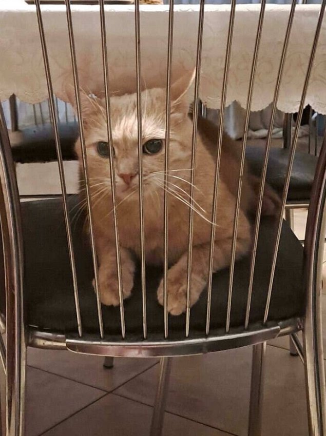 Арестованный по делу «кусок ветчины» добровольно сел за решётку… стула. Взгляд говорит: «Адвоката не надо, просто открой холодильник». Возможен УДО за хорошее мурчание.