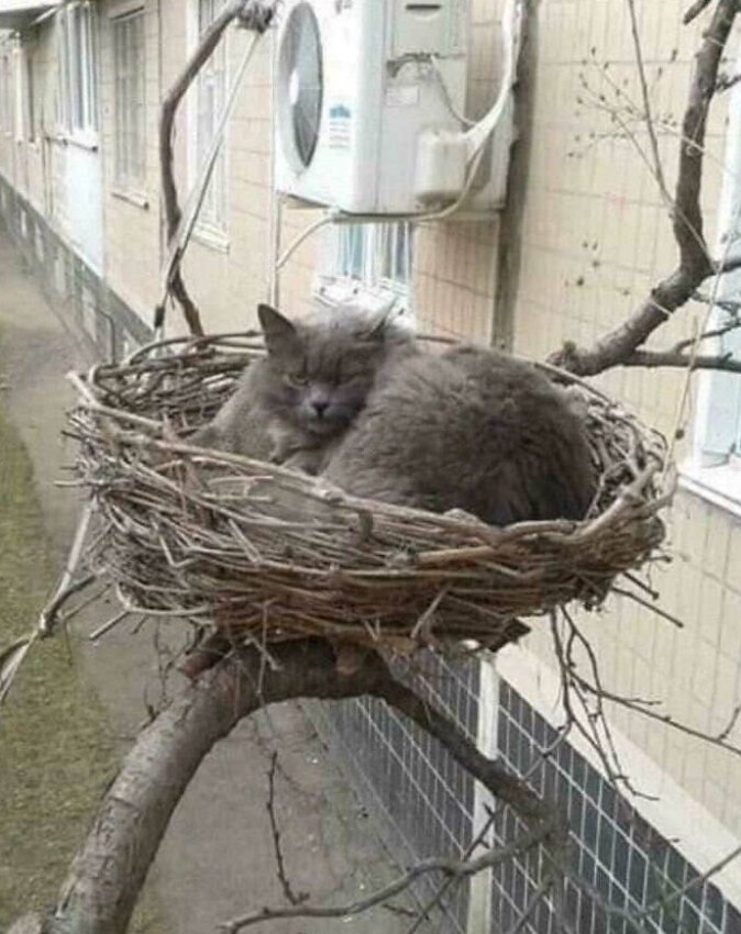 Захват гнезда прошёл без единого писка. Птичий ЖКХ в лёгком шоке, но новый жилец оплатил аренду мурчанием. На табличке мелким шрифтом: «Возможна временная смена видового состава». Весна будет интересной.