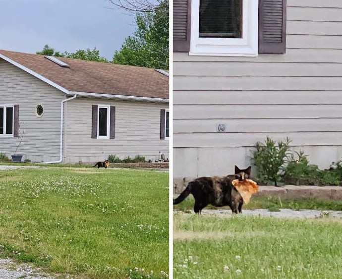 Свежая доставка — одна большая пицца, курьер без чаевых. Кот движется к убежищу, не покидая режим невидимости. На вопрос «откуда?» отвечает честно: «из соседского окна». Миссия выполнена, сыр — в безопасности.