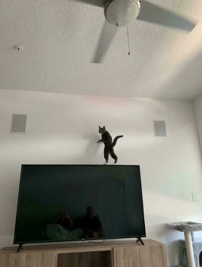 Ходьба по воздуху — новая программа тренировок. Кот отвергает подлокотники и полки, предпочитая невидимые тропы над телевизором. Вентилятор сверху — как вертолёт прикрытия. Домовые духи аплодируют стоя.
