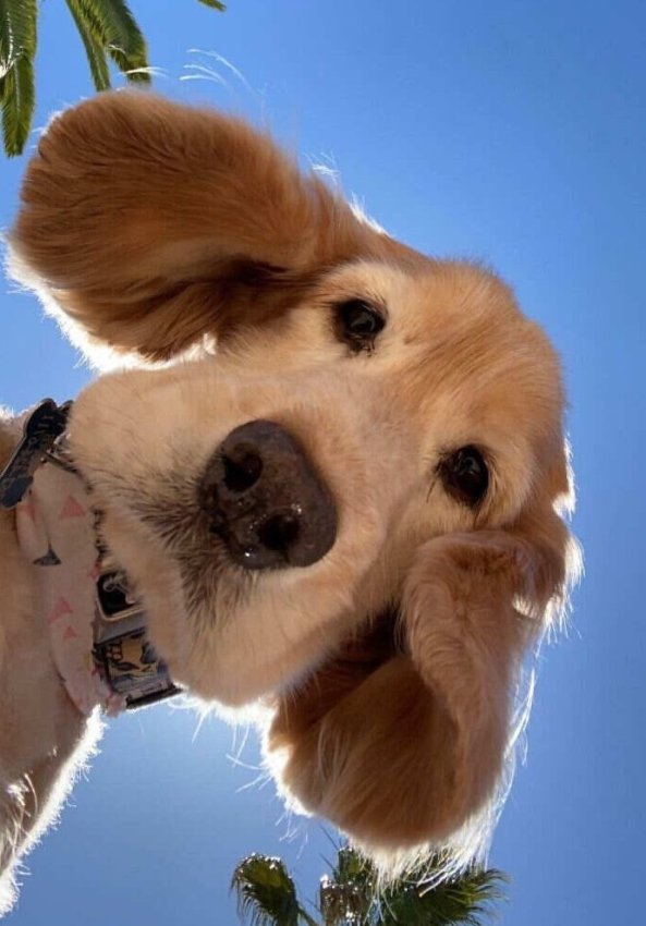 Один ухо на ветру, голубое небо на фоне и выражение чистейшей радости! Этот золотистый красавец случайно создал идеальную композицию для обложки альбома. Съёмка снизу, естественное освещение и искренняя улыбка — профессиональные фотографы могут поучиться у этого пса.