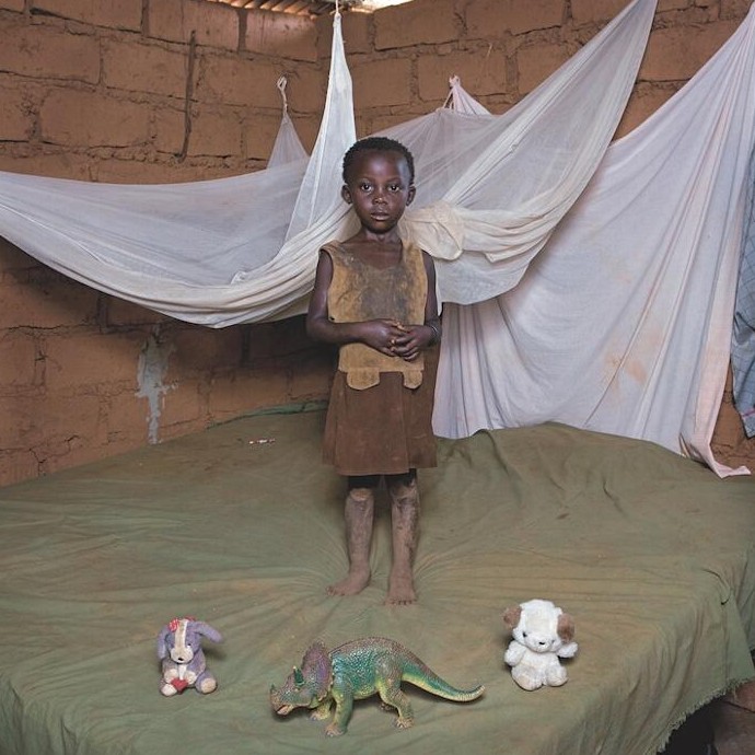 Три друга на зелёном покрывале: плюшевый слоник, резиновый динозавр и белая овечка. Это всё богатство девочки из африканской деревни с глиняными стенами. Москитная сетка над кроватью — единственная роскошь в этом скромном жилище. Грязные ноги и потрёпанное платье говорят о жизни без излишеств. Но три игрушки для неё — целая вселенная приключений и фантазий.
