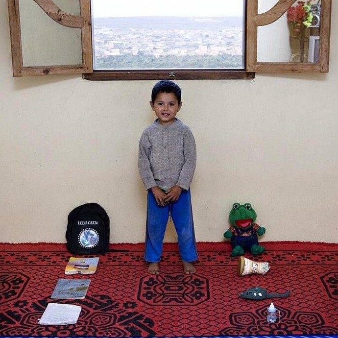 Рюкзак, несколько карточек, зелёная лягушка и машинка — весь мир этого мальчика помещается в крошечный набор. За окном открывается вид на город, но в комнате царит аскетичная простота. Красный узорчатый ковёр — главное украшение пространства. Этот ребёнок знает цену каждой своей игрушке, ведь у него их можно пересчитать по пальцам одной руки.