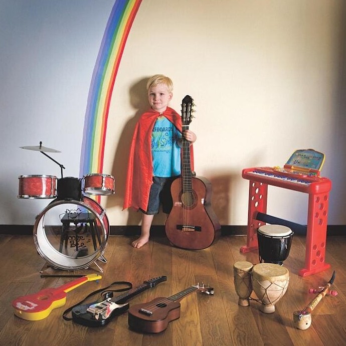 Настоящий оркестр одного человека! Барабаны, гитары, синтезатор, бубны — этот маленький музыкант может устроить концерт в любой момент. Радуга на стене словно намекает на яркое творческое будущее. Родители явно из семьи музыкантов, иначе откуда у ребёнка такой арсенал инструментов? Осталось только научиться играть на всём этом богатстве одновременно!