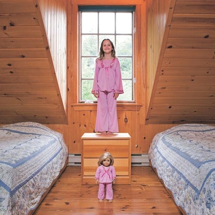 Минимализм по-американски: всего одна кукла в розовой пижаме. Девочка из деревянного домика явно не гонится за коллекциями и изобилием. Две кровати, тумбочка и единственная подруга-кукла — всё, что нужно для счастливого детства. Иногда меньше действительно значит больше.