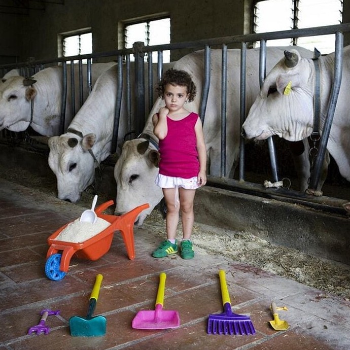 Когда твоя игровая площадка — настоящий коровник! Эта юная фермерша окружена не плюшевыми животными, а живыми коровами, а её игрушки — яркие тачка и инструменты для уборки. Судя по уверенной позе, девочка чувствует себя здесь как дома. Её детство проходит не в четырёх стенах детской, а среди запахов сена и мычания скота.