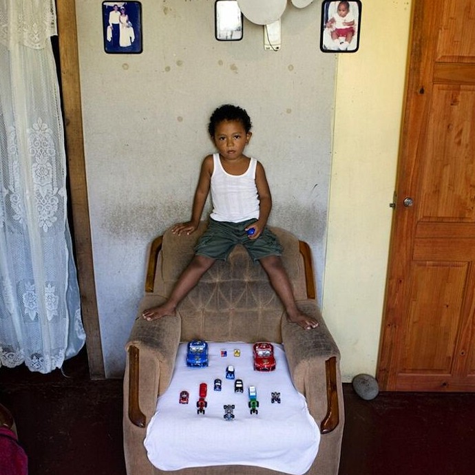 Одна-единственная полицейская машинка — и больше ничего. Этот мальчик стоит на потрёпанном диване с гордостью победителя, ведь у него есть своя игрушка. Облупившиеся стены и старая мебель контрастируют с его счастливым лицом. Когда у тебя всего одна машинка, она становится самой лучшей машинкой в мире.