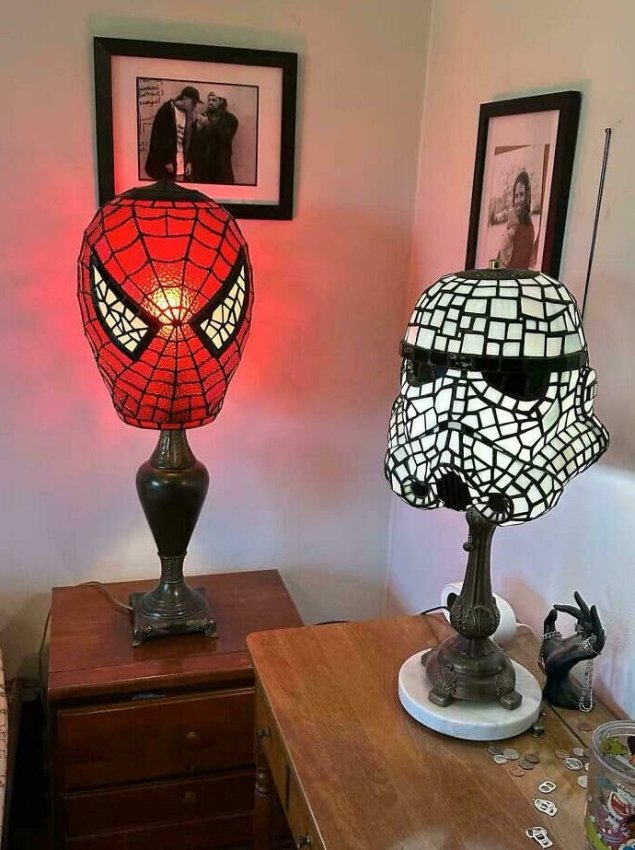 Когда фанатская любовь к поп-культуре встречается с навыками работы с витражом, рождаются такие шедевры! Человек-паук и штурмовик превратились в функциональные светильники, которые днем выглядят как скульптуры, а вечером создают атмосферное освещение. Каждый кусочек стекла вырезан и подогнан вручную, превращая культовых персонажей в уникальные арт-объекты. Это тот редкий случай, когда «гиковский» декор выглядит по-настоящему стильно и профессионально!