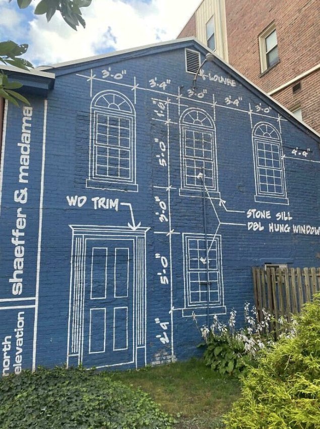 Фасад здания превратился в гигантский архитектурный план с размерами, заметками и эскизами. Это мета-дизайн в чистом виде: здание само рассказывает о процессе своего создания. Когда архитектура становится самоироничной и превращает свою «изнанку» в художественный элемент — это уже не просто строение, а концептуальное высказывание.
