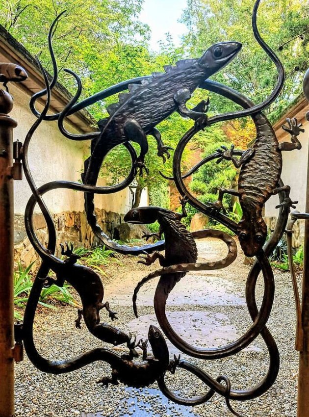 Эти ворота превращают обычную калитку в портал в сказочный мир, где металлические ящерицы замерли в вечном танце. Кузнец создал не просто функциональный элемент, а настоящую скульптуру, которая охраняет вход и одновременно приглашает войти. Когда ремесло встречается с фантазией — рождаются произведения искусства, которые будут восхищать десятилетиями.
