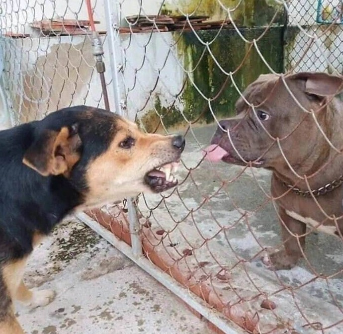 Левая собака: «Слушай, Джек, может хватит? Прошло уже три года.» Правая собака: «Никогда не прощу тебе ту косточку, предатель!» Драма достойная мексиканского сериала, но в исполнении дворовых псов и через сетку-рабицу.