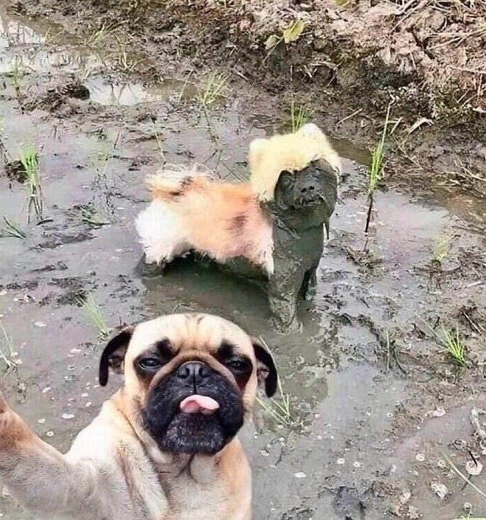 Один пёс: «О да, грязевые ванны! Это же лучше любого салона красоты!» Мопс: «Билли, это ЛУЖА. Обычная грязная лужа, а не процедура за 5000 рублей.» Два совершенно противоположных взгляда на концепцию счастья и гигиены.