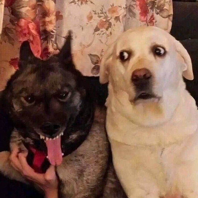 Черный пёс: «Я ОБОЖАЮ ЭТУ ПЕСНЮ! ДАВАЙ ТАНЦЕВАТЬ!» Белый лабрадор: «Боже, Рекс, сколько можно? Мы просто пришли за кормом.» Классическая ситуация: один готов перевернуть мир, второй просто хочет спокойно дожить до ужина.