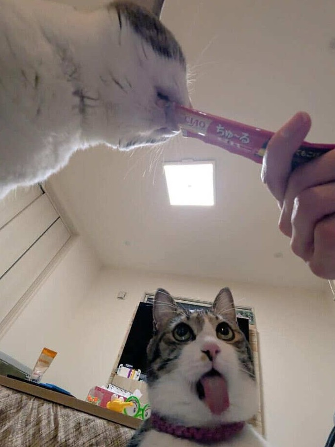 Кот внизу: «Вызывали священника?» Кот сверху: переживает духовную трансформацию и общается с потусторонними силами через палочку Чуру. Когда лакомство настолько вкусное, что твоя душа временно покидает тело и улетает в Нирвану.