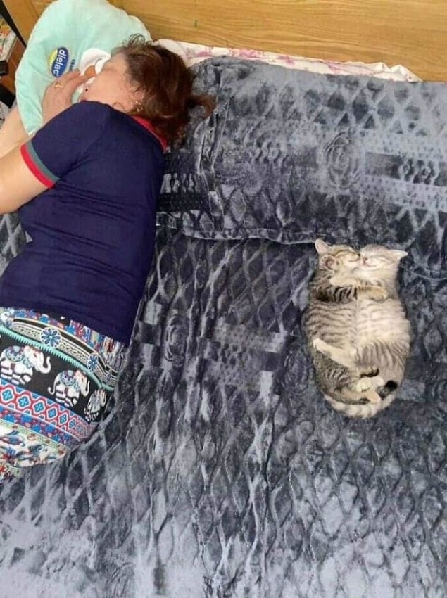 Пока бабушка спит сном праведника, коты демонстрируют продвинутую йога-позу «мертвого таракана» в исполнении профессионалов. Восемь лап врозь, живот наружу, абсолютное доверие к миру — именно так выглядит настоящая релаксация. Если бы коты вели курсы по управлению стрессом, этот товарищ был бы главным инструктором.