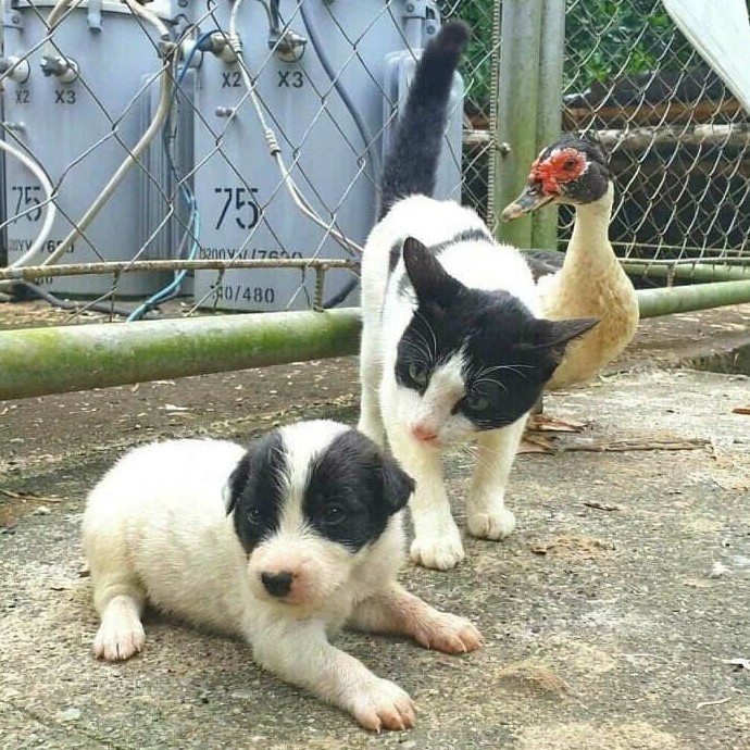 Котенок и щенок решили подружиться, и их отношения уже получили официальное благословение местного утиного совета. Обратите внимание на идеальную синхронность окраса — черно-белая гармония, которой позавидовала бы любая дизайнерская студия. Утки на заднем плане явно обсуждают, стоит ли принять этих двоих в свою стаю.