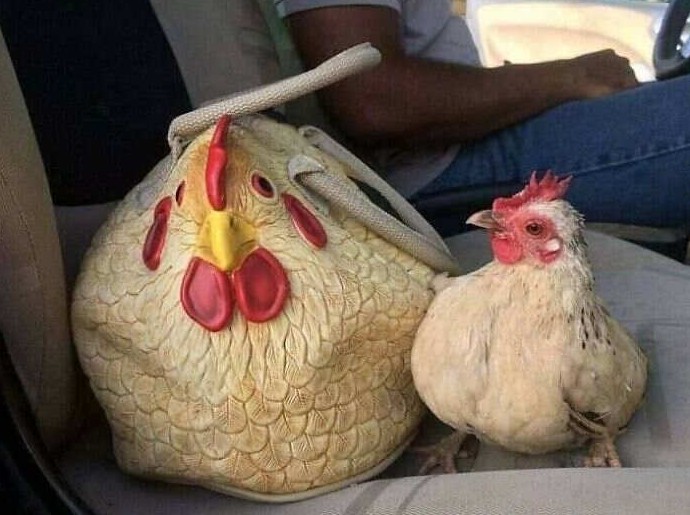 Курица всю жизнь считала себя уникальной, пока не встретила свою сумку-переноску. Взгляд недоумения, легкая паника в глазах — «Кто из нас настоящий?» Хозяин явно обладает специфическим чувством юмора, выбрав для перевозки курицы сумку в форме… курицы. Это как если бы вас посадили в рюкзак с вашим собственным портретом на всю спину.