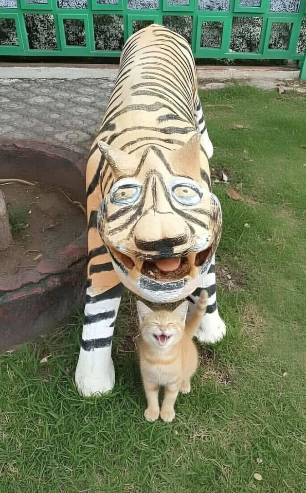 Маленький рыжий котенок решил бросить вызов статуе тигра и доказать, что он тоже может рычать устрашающе. Судя по открытой пасти и боевому настрою, он абсолютно уверен, что выглядит так же грозно, как его полосатый собрат. Статуя, конечно, молчит, но если бы могла говорить, она бы сказала: «Малыш, у тебя получается!»