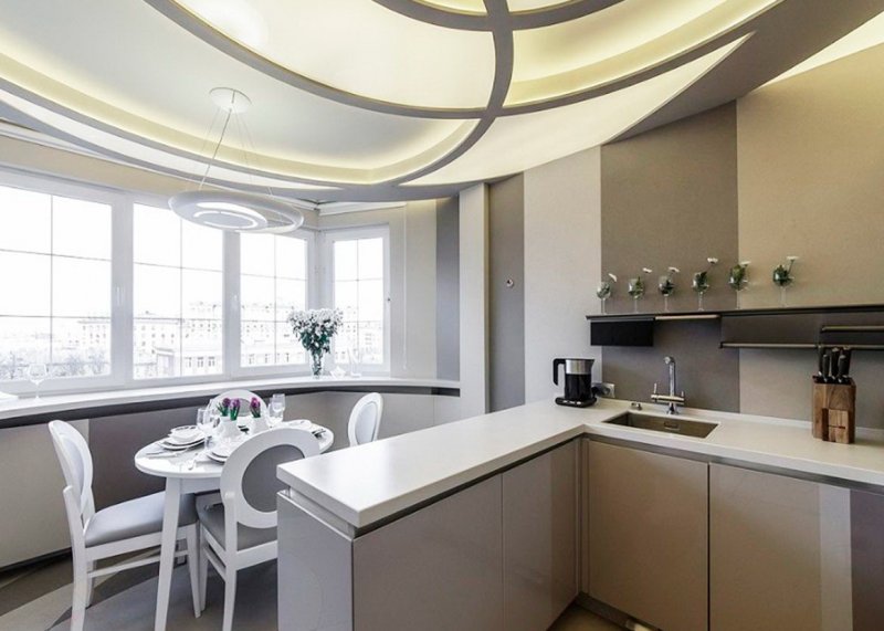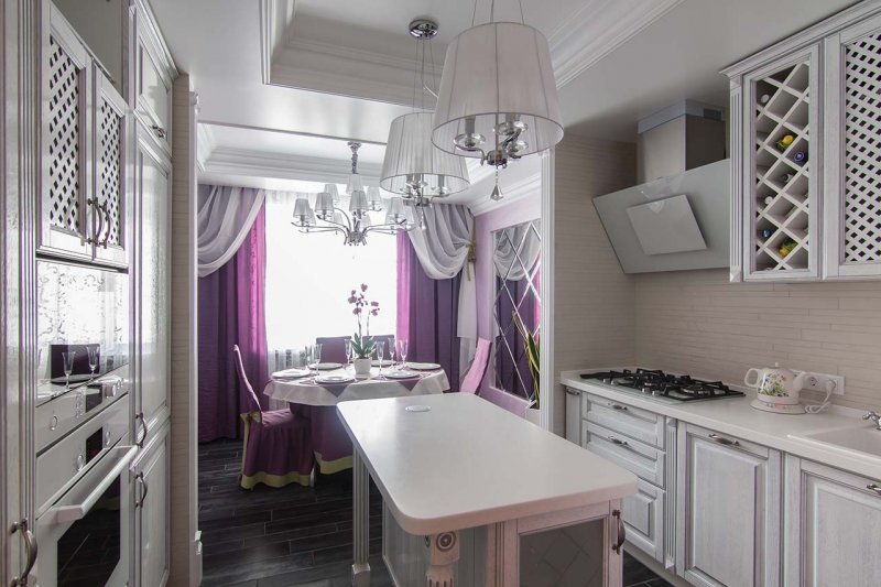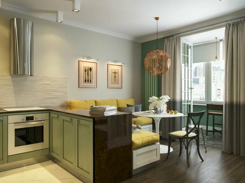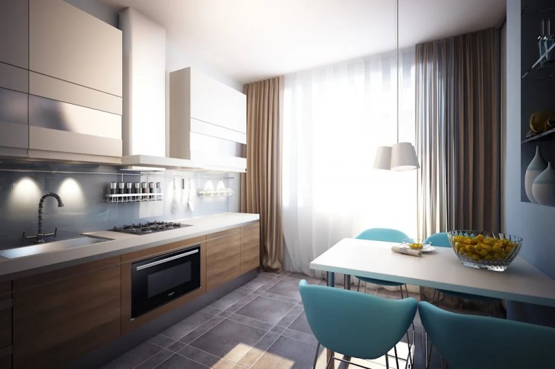 Современная кухня может иметь любую планировку. Если из комнаты есть выход на закрытую лоджию или балкон, там можно оборудовать обеденную зону. Дверь убирают вовсе или завешивают проем незаметными однотонными шторами, легким тюлем, подходящим под интерьер.