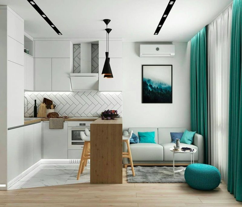Если же акцент делается на комфортное времяпровождение, то кухонная зона оборудуется по минимуму. Выбирается компактная мебель, встраиваемая бытовая техника, уменьшается рабочая поверхность. При этом пространство лучше оставить целостным, отказаться от использования некоторых способов зонирования, например, организации подиума, установки перегородок, барной стойки, прочего.