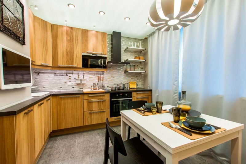 Угловая или Г-образная мебель – отличный вариант для квадратных помещений. Для расположения кухонного гарнитура можно использовать угол между двумя глухими стенами, либо захватить часть перегородки с оконным или дверным проемом. При этом в комнате остается достаточно места для установки обеденного стола на несколько персон. К тому же это удачная конфигурация для организации кухни-гостиной.