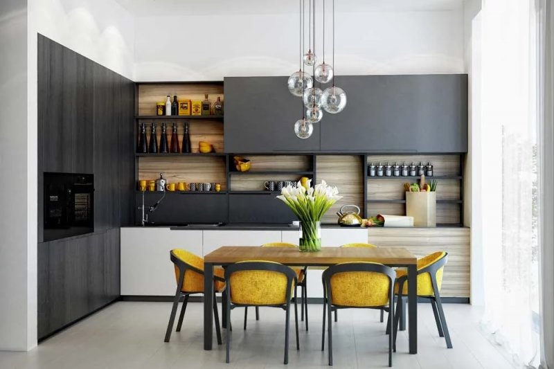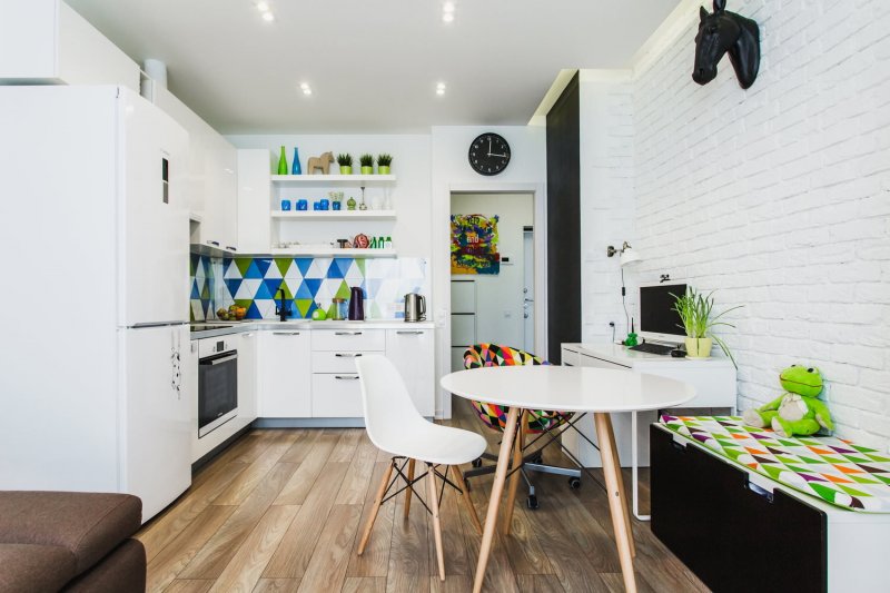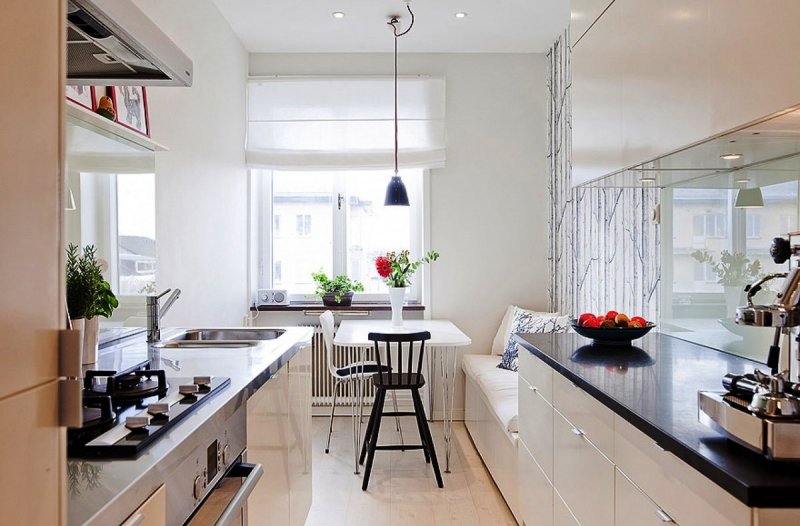 В этом случае рекомендуется максимально использовать потенциал стен. Вешать на них полки, навесные шкафы, достигающие потолка. Для разделения функциональных зон используется обеденный стол, под которым дополнительно можно организовать подиум. Также в качестве зонирования можно применять осветительные приборы, выбрать разные по цвету или составу отделочные материалы.