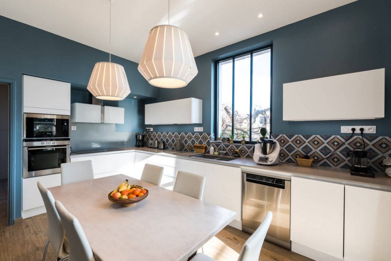 Интерьер такой кухни делают однотонным. Яркие цвета выступают в качестве акцентов и очень дозировано. Чтобы разнообразить скучный дизайн, используют сочетание фактур. Хорошо смотрятся в одной композиции глянцевые и матовые поверхности, камень и дерево, различные панели с 3D эффектом.