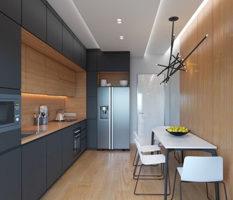 Не всегда вдоль одной стены можно полностью разместить все необходимое. В этом случае можно установить мебель в две линии. Расположение мебельных модулей в два ряда еще называют параллельной планировкой. Она уступает в популярности Г- и П-образным способам организации пространства, но стоимость гарнитура будет на порядок дешевле, из-за отсутствия торцевых элементов и угловых шкафов.