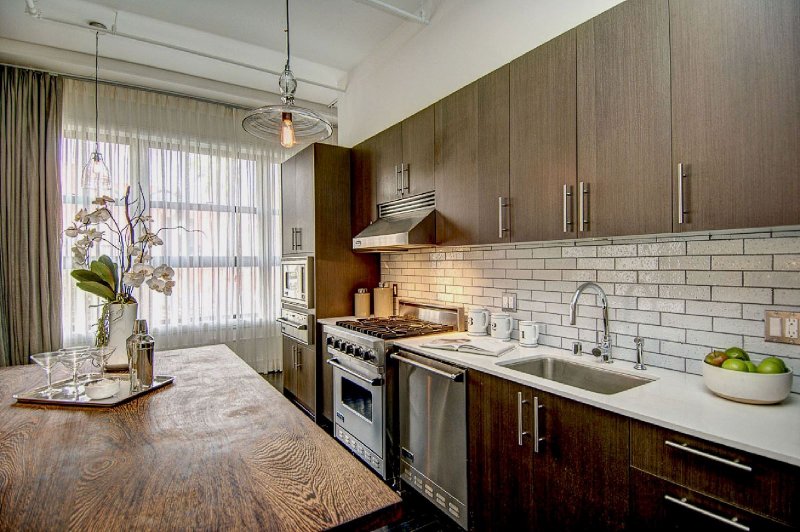 Отделочные материалы должны максимально сохранять наготу коммуникаций и прочих первоначальных конструкций. Стены оставляют бетонными или облицовывают кирпичом, потолок просто белят, а пол выкладывают плиткой. Типичные оттенки для лофта – пепельный, терракотовый. Кухня полностью открыта, без перегородок и прочих вариантов зонирования.
