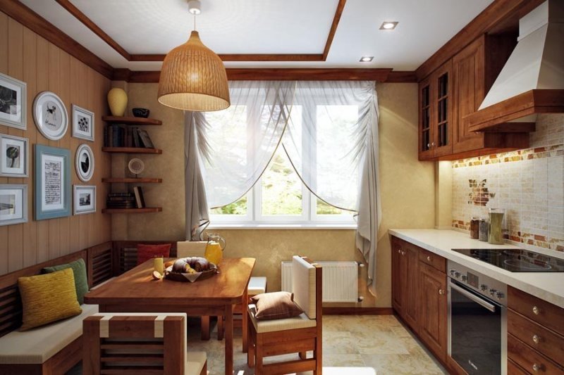 В интерьере такой кухни уместны любые деревенские мотивы. Настоящее очарование и романтизм передадут пастельные тона в отделке, винтажная мебель, эмалированная посуда на открытых полках и нежные занавески вместо дверок гарнитура.