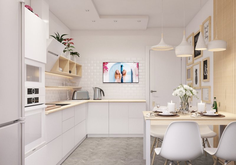 Современная просторная кухня часто используется не только как место приготовления пищи, но и как зона отдыха. Для большего комфорта такие комнаты оснащают телевизором по типу спального проекта. Чтобы все домочадцы получали удовольствие от просмотра любимых передач, его надо установить в удобном месте. Чаще расстановку проводят по таким схемам: