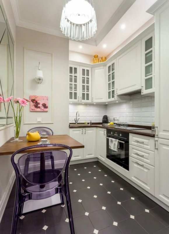 В классической кухне стены и потолок делают идеально ровными. Возможно присутствие небольшого количества лепнины, эркера. Добиться оригинальности можно с помощью большой картины или коллажа в массивной рамке. Также отличным украшением будет необычная люстра или напольный торшер интересного дизайна.
