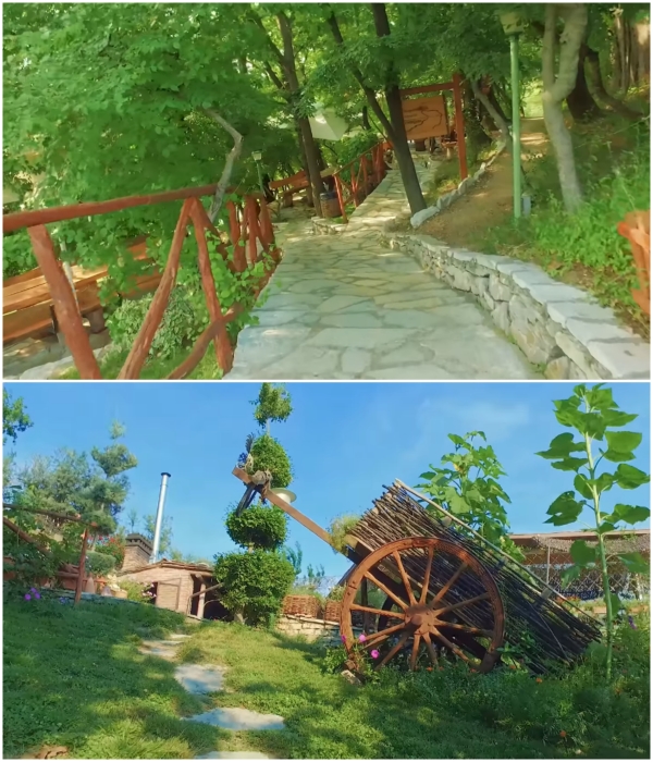 Из каждого номера есть выход на зеленую территорию внутреннего двора и ферму (Mrizi i Zanave Agroturizеm, Албания). | Фото: youtube.com, © Egon Musliu.Из этих номеров есть выход во внутренний дворик, где можно прогуляться на свежем воздухе, заглянуть в теплицу и даже винодельню. Или отправится посмотреть виноградники, сады и поля, на которых выращивают фрукты и овощи для обеденного стола. Также разрешается «пообщаться» с животными и птицами на фермах или просто пообедать на открытой площадке среди деревьев.