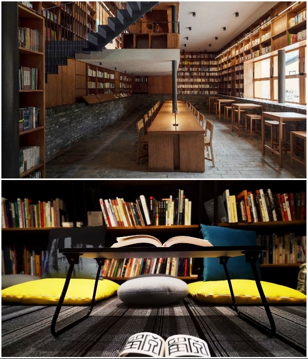 Общие лаунж-зоны необычного отеля тоже заставлены полками и стеллажами с книгами («Liuyue Capsule Hotel», Китай). | Фото: worldarchitecture.org.Полезная информация: Самый маленький номер в «Liuyue Capsule Hotel» для одного взрослого посетителя обойдется всего лишь 15 дол. в сутки. В эту стоимость входит даже завтрак, а вот обед и ужин можно заказать в ресторане, который находится в деревне, или купить готовую еду в автоматах или мини-маркете на территории комплекса.