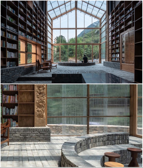 Наслаждаться чтением и отдыхом можно и внутри помещения и на свежем воздухе («Liuyue Capsule Hotel», Китай). | Фото: worldarchitecture.org.Конечно же, самым излюбленным местом для чтения, общения или полного расслабления является стеклянный атриум, с которого открывается неимоверно красивый вид на живописные горы. Именно этот уголок остался без стеллажей с книгами, лишь полукруглая каменная скамья с крошечными столиками перед огромным стеклянным фасадом украшают эту часть строения.