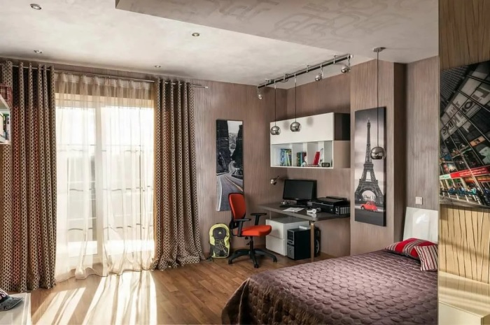 Спальня в молодежном стиле. /Фото: avatars.mds.yandex.netОсновная черта молодежного стиля — наличие гаджетов, необычных пуфов, мебели-трансформер, водяного матраса и декора ручной работы. Интерьер спальни в таком стиле не загружен лишними деталями и предполагает использование стекла, металла и пластика. В дополнении может быть использован текстиль и натуральное дерево.Полезный совет от Novate.ru: Цветовая гамма спальни в молодежном стиле может быть самой разнообразной. Здесь нет четких ограничений. В зависимости от предпочтений это могут быть контрастные сочетания черного и белого, смешение ярких оттенков или нежно-пастельная гамма.