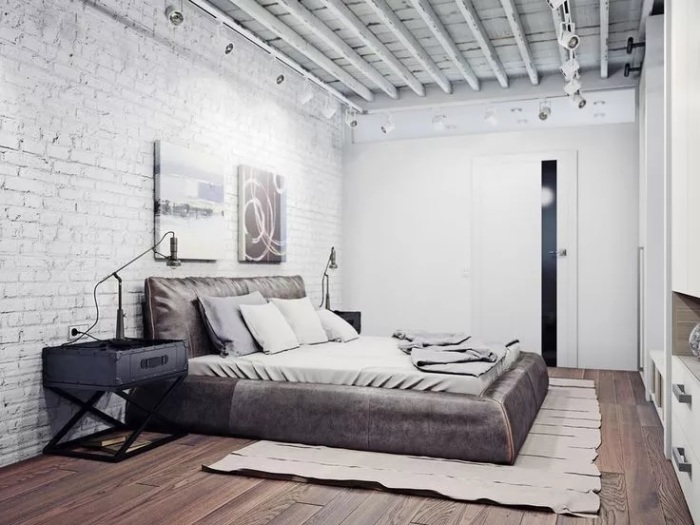 Спальня в стиле лофт. /Фото: media.dom-i-remont.infoСейчас в моде сдержанность и минимализм. Стиль лофт как нельзя лучше соответствует этим требованиям. Интерьер спальни в этом стиле — это максимальное количество свободного места, большие оконные проемы, оригинальные элементы декора, контраст фактур и холодных оттенков. Стены покрываются грубой штукатуркой или оформляются кирпичной кладкой. Потолки окрашиваются в белый цвет и декорируются серыми досками.