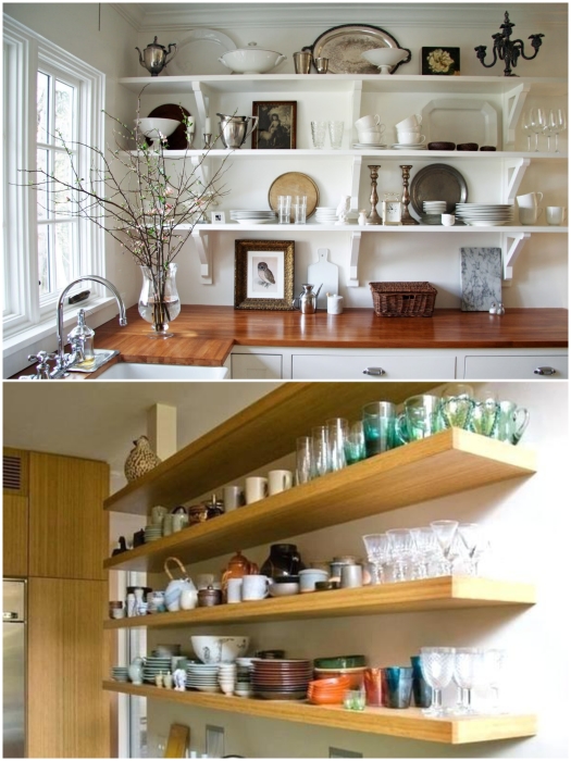 На открытых полках в кухне располагать нужно только самые востребованные столовые предметы и технику. | Фото: demidov-art.ru/ yandex.ru.То же самое касается размещения посуды или мелкой бытовой техники на кухне. Зачастую на открытые полки выставляют все самое красивое и модное, но этими предметами совсем не пользуются. А они тем временем обрастают неприятным жирным налетом, который периодически надо смывать. Если же на эти полки поместить самые востребованные предметы/технику, то они никогда не загрязнятся просто от нахождения в одном месте. В этом случае останется следить только за чистотой поверхности полки.3. Открытая полка может стать декоративным украшением, ярким акцентом и даже эксклюзивным арт-объектом