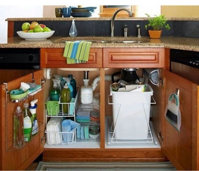 Правильно организованное хранение под раковиной. / Фото: Zhenskij.mirtesen.ru• место под столешницей – там можно разместить крючок для бумажных полотенец. Кстати, его можно закрепить на липучки, тогда сверление не понадобится.Главный принцип при организации хранения следующий – то, чем вы часто пользуетесь, должно быть под рукой и располагаться на виду. А вещи, которые вам нужны пару раз в неделю, лучше сразу спрятать в шкаф или на холодильник.Также вам смогут помочь советы, описанные в статье Как сделать кухню просторной и аккуратной при помощи подручных средств