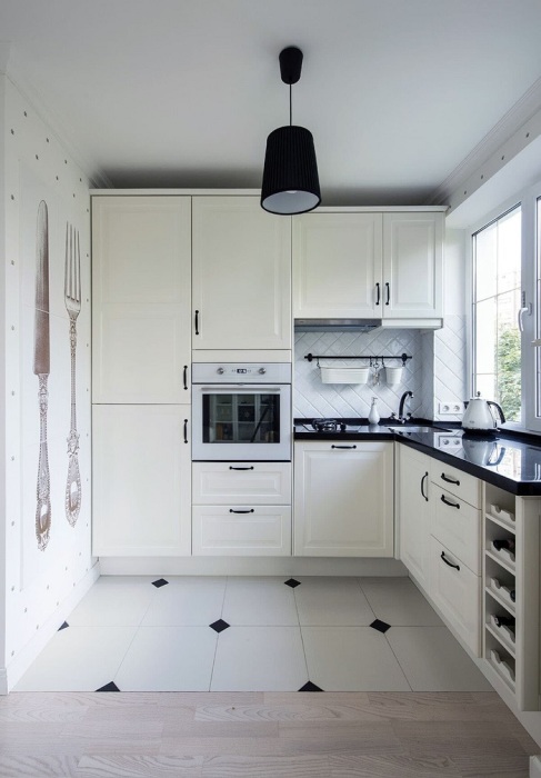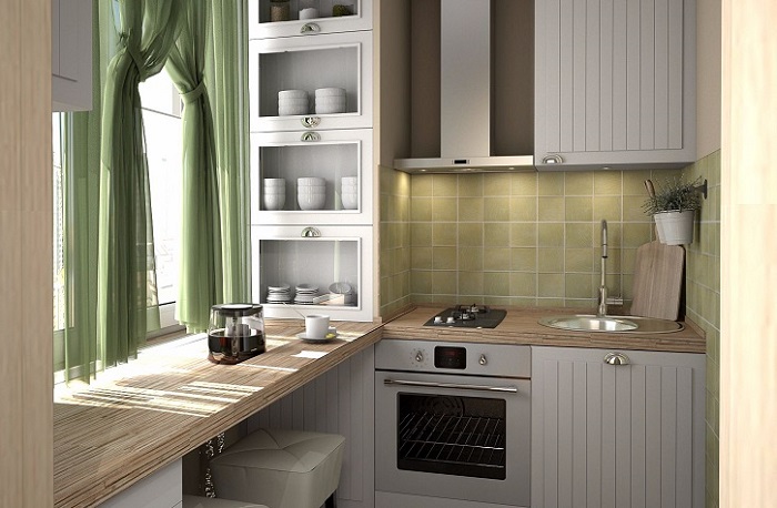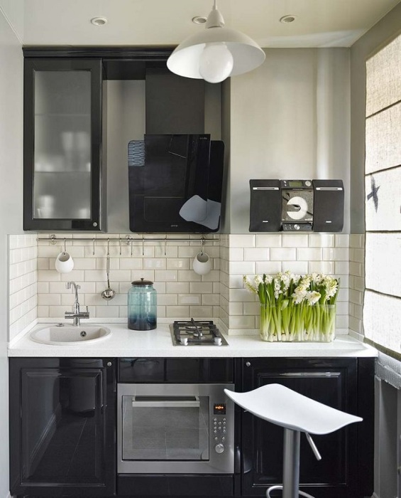 Мебель, сделанная на заказ - идеальный вариант. / Фото: Adcitymag.ruУчитывая тот факт, что на такой крохотной кухне каждый сантиметр на вес золота, вариант с покупкой готового углового гарнитура в обычном мебельном магазине не подходит. Лучше всего составить индивидуальный проект, в котором будут учитываться все ваши пожелания, а также площадь и особенности кухни. Вы сможете не только предусмотреть нишу для микроволновой печи, место для вытяжки, но также самостоятельно подобрать материал и фурнитуру будущей мебели. Существенным минусом является только стоимость – она будет в несколько раз выше, чем при покупке готового гарнитура. Однако помните, что вы в первую очередь платите за свое удобство и комфорт. К тому же, кухня оформляется ни на один год, поэтому в ваших же интересах, чтобы она соответствовала абсолютно всем требованиям.